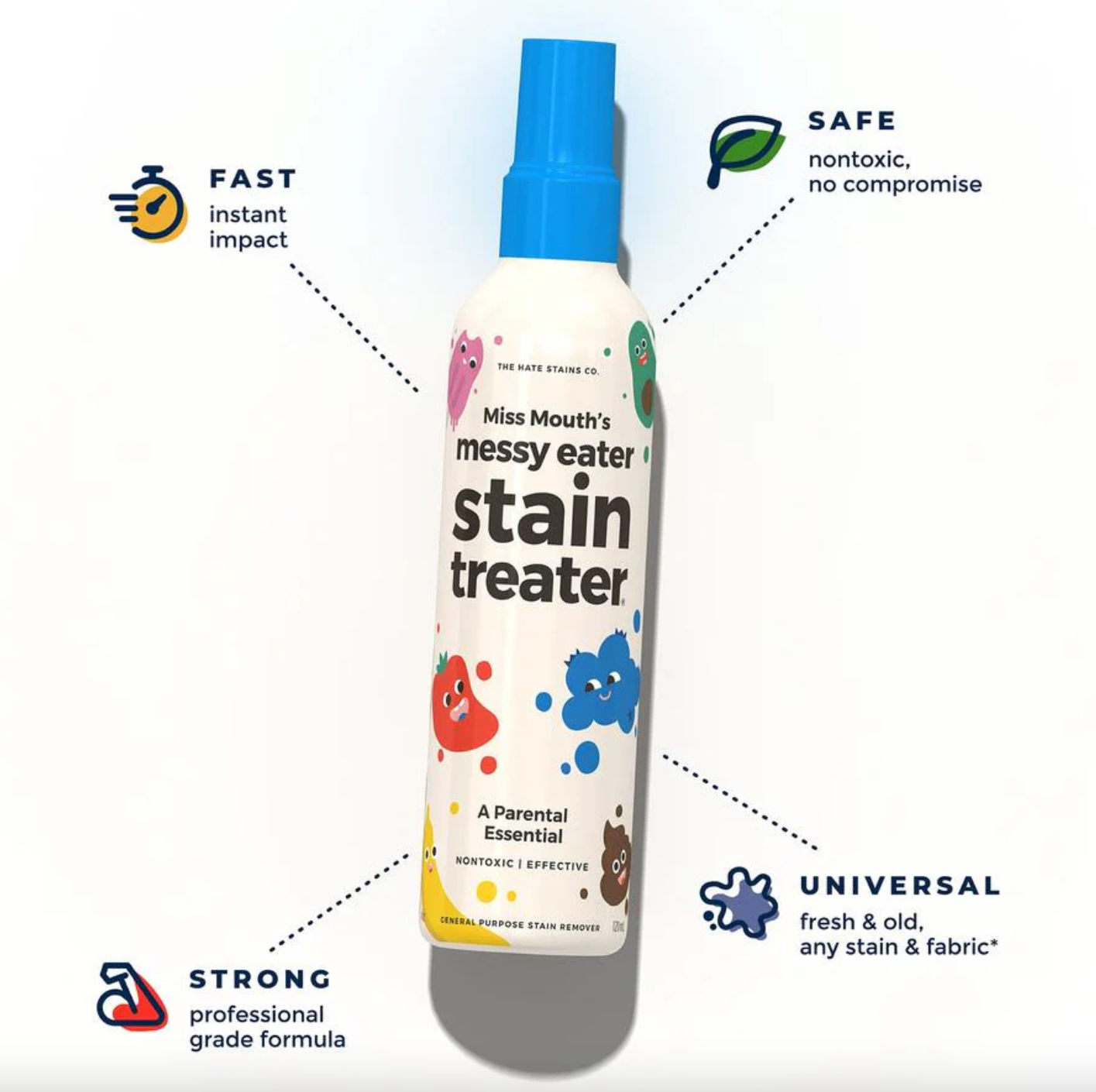 Everything from juice, ketchup, and baby food to dirt, grass, and even harder stains like wine or coffee. If it’s a mess, it can help lift it.